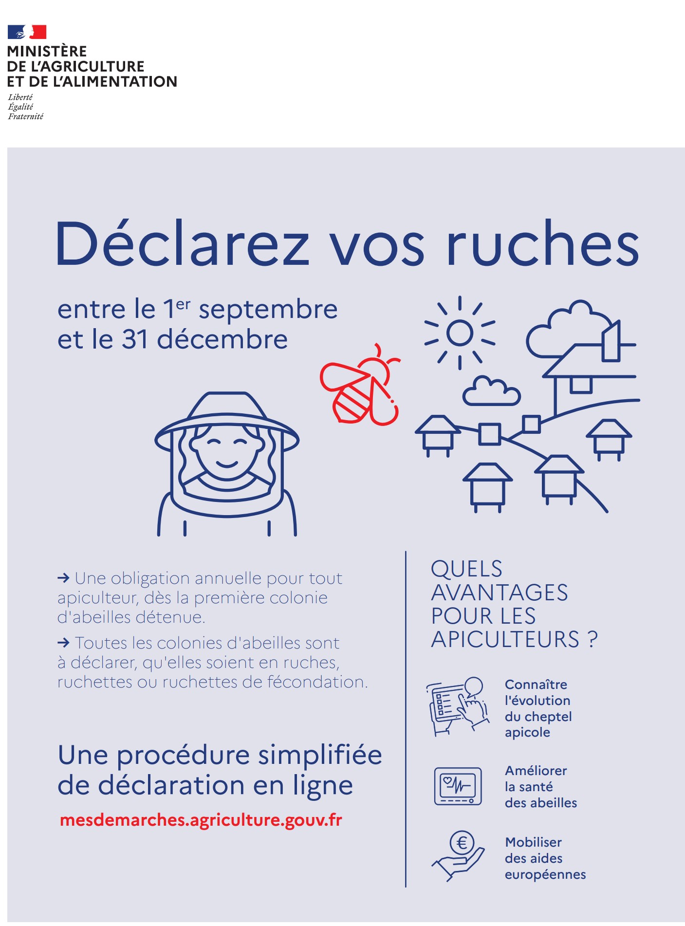 Tout propriétaire ou détenteur de colonies d'abeilles - dès la 1e ruche - a l'obligation de procéder à une déclaration de détention et d'emplacement de ruches pendant la campagne annuelle qui a lieu entre le 1er septembre et le 31 décembre. Il est important que les apiculteurs n’ayant pas effectué de déclaration en 2023 puissent avoir cette information (les apiculteurs déclarés en 2023 et ayant renseigner un mail, reçoivent un mail de rappel). C’est pourquoi, nous comptons sur vous pour diffuser cette campagne à vos administrés. La page internet dédiée aux déclarations de ruches reste la référence sur le site Mes démarches : https://mesdemarches.agriculture.gouv.fr/demarches/particulier/effectuer-une-declaration-55/article/declarer-des-ruches Les apiculteurs ne disposant pas de connexion pour faire une télédéclaration peuvent procéder à une déclaration de ruches par voie postale. Pour la campagne 2024, l'adresse d'envoi et les formulaires papier ont été modifiés.