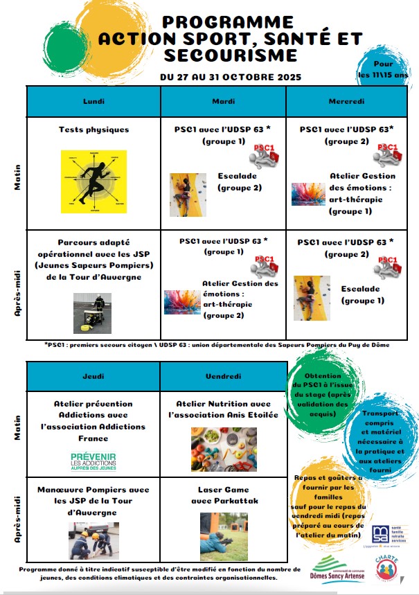 Durant ces 5 jours, il suivra la formation secourisme aux premiers secours, participera à des ateliers de prévention sans oublier des activités sportives.